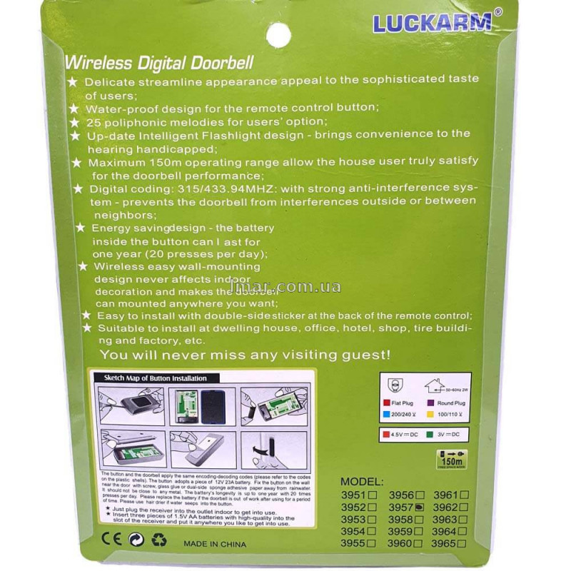 Звонок дверной беспроводной LUCKARM 3957, на батарейках, с регулировкой громкости, 25 мелодий, до 150 м