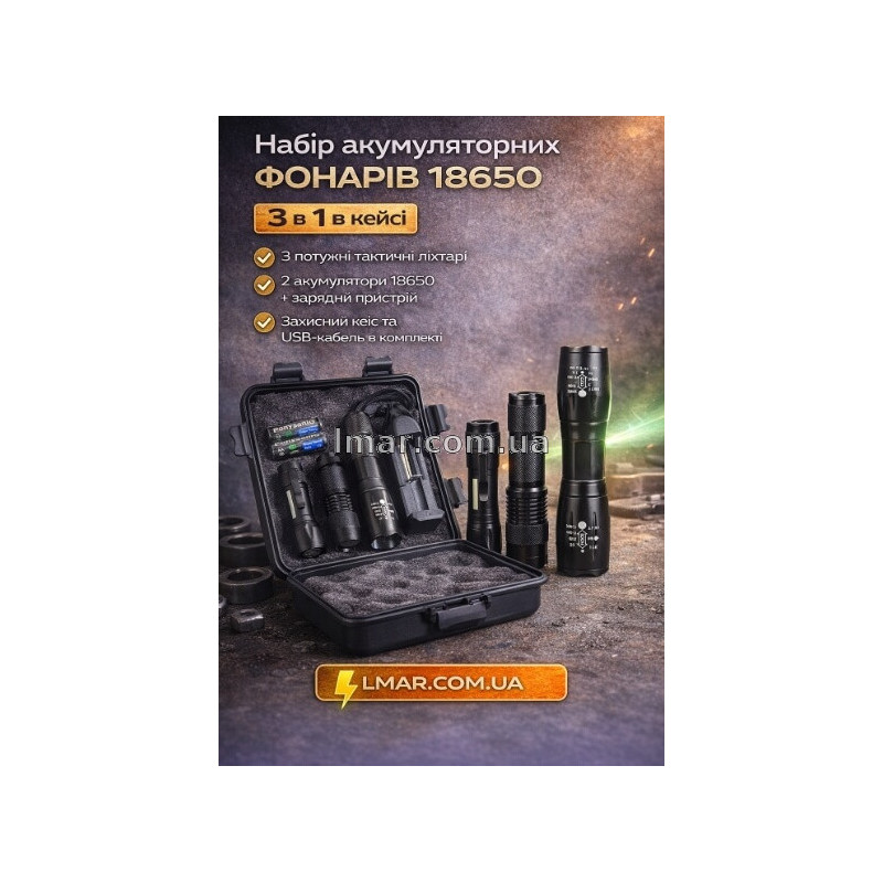 Набор аккумуляторных фонарей 18650 3 в 1 — это практичный комплект тактических фонарей в прочном защитном кейсе. В набор входят три фонаря разного формата, аккумулятор 18650, зарядное устройство и дополнительные элементы питания. Это универсальное решение для работы, активного отдыха и использования в экстренных ситуациях.