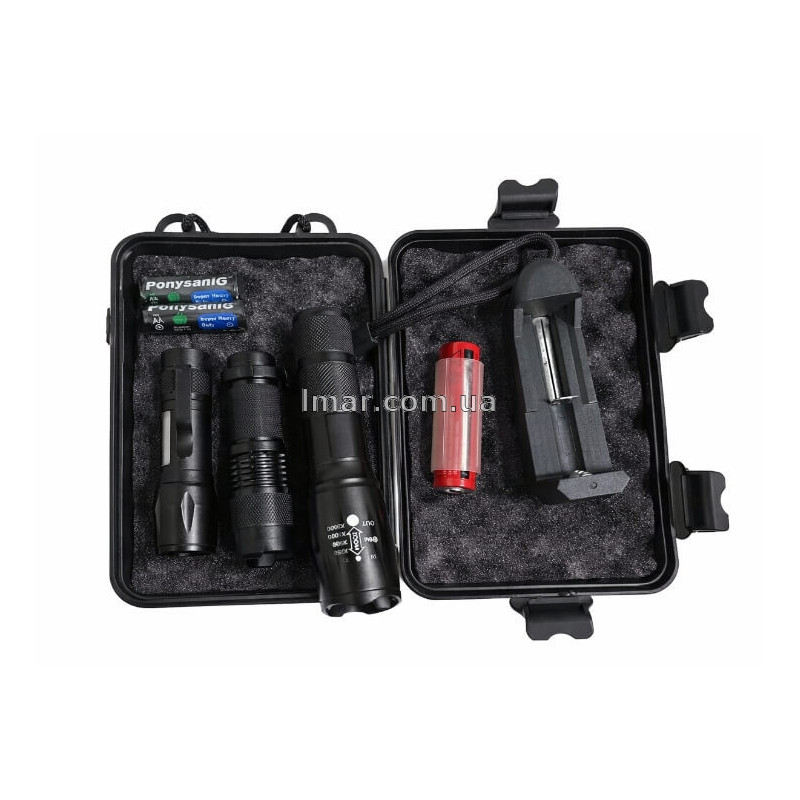 В комплект входят три фонаря, аккумулятор 18650, адаптеры под батарейки, зарядное устройство и защитный кейс.