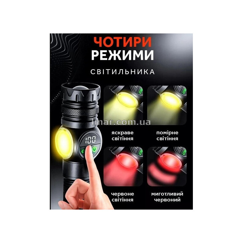 Корпус выполнен из прочного износостойкого материала с рифленой поверхностью для надежного хвата. Эргономичная форма позволяет удобно держать фонарь в руке, а ремешок повышает комфорт при переноске. Встроенный магнит помогает фиксировать фонарь на металлических поверхностях, освобождая руки во время работы. Цифровой дисплей отображает уровень заряда аккумулятора, что особенно удобно при длительном использовании.