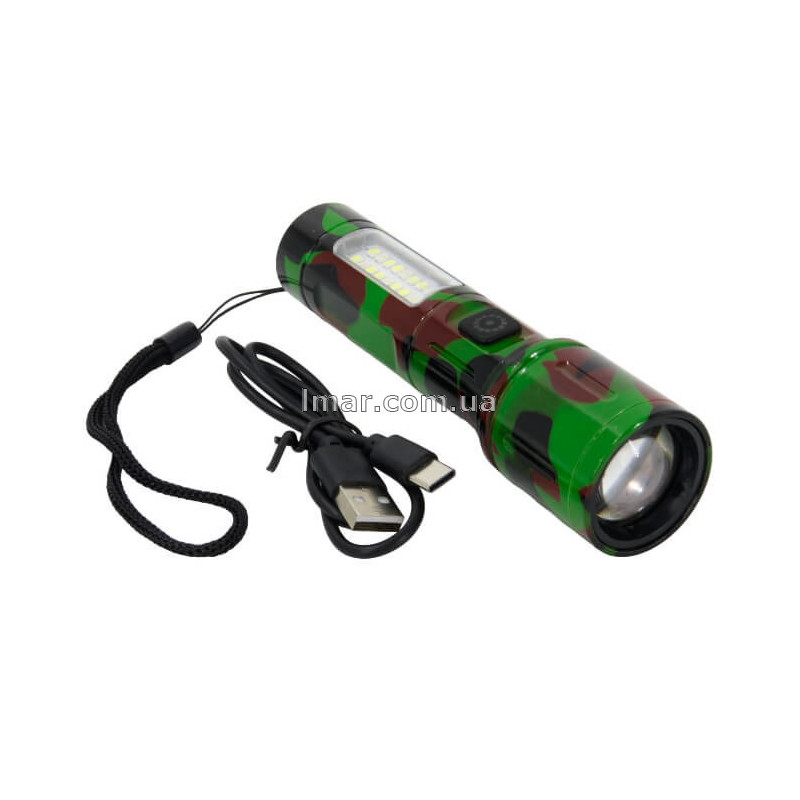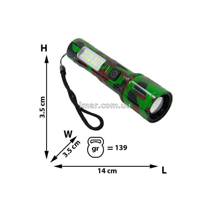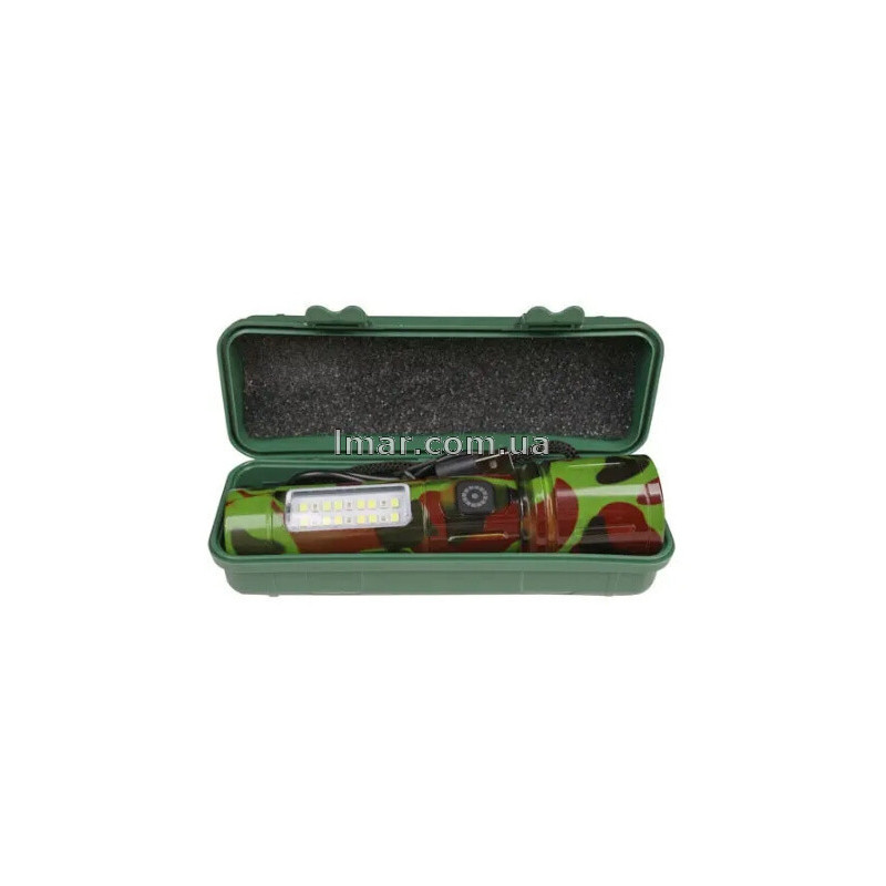 Корпус выполнен из прочного пластика с камуфляжным покрытием. Фонарь имеет компактную цилиндрическую форму, ремешок на руку и удобную кнопку управления режимами. Конструкция лёгкая и удобная для повседневного использования. По фото параметры модели: длина 14 см, ориентировочный диаметр — 3.5 см, вес — около 139 г.