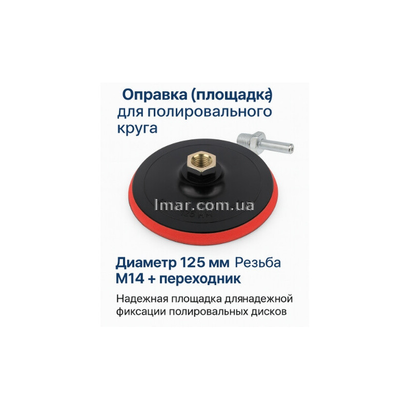 Оправка-площадка для полировального круга 125 мм с резьбой М14 и переходником. Подходит для шлифовальных машин и дрелей. Прочный корпус, надёжная фиксация и удобство использования дома, в гараже и мастерской