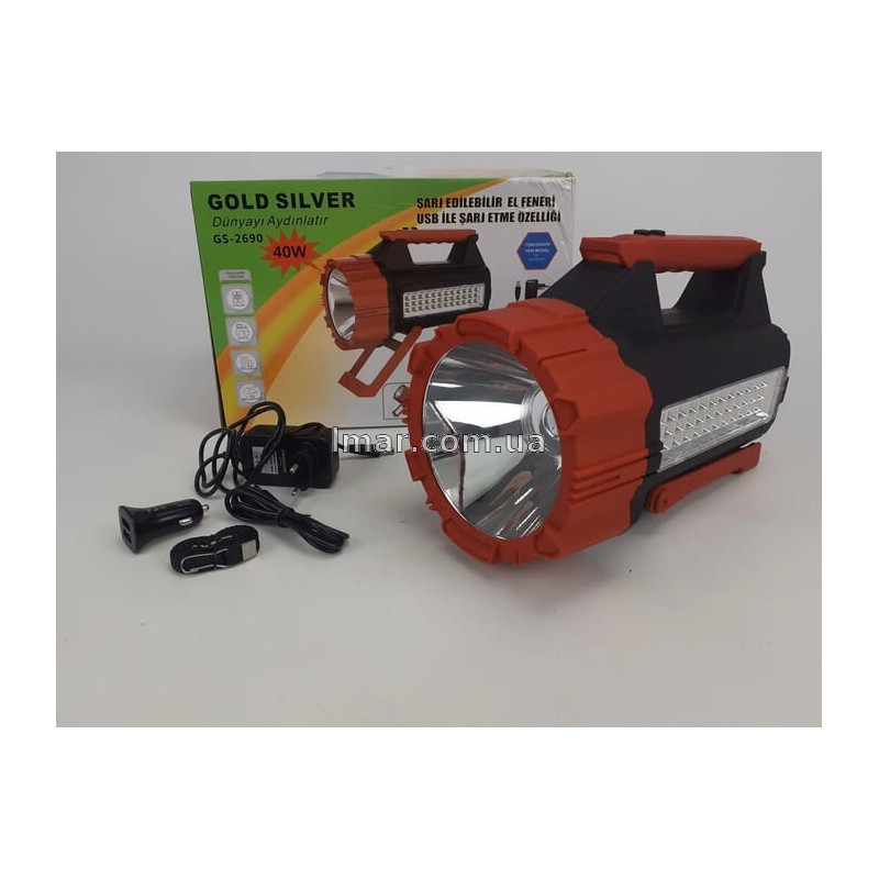 GOLD SILVER GS-2690 40W — это современный комбинированный фонарь с дальнобойным прожекторным лучом и яркой боковой SMD-панелью. Он создан для тех, кому нужен мощный автономный свет дома, на работе или на природе. Отличается лёгкостью, высокой яркостью, удобной ручкой и длительной автономностью.