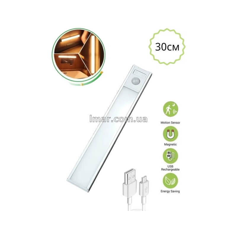 LED світильник акумуляторний 30 см з датчиком руху, магнітний, USB зарядка, для шафи та кухні