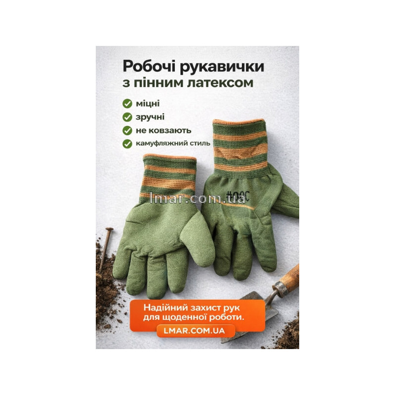 Рабочие трикотажные перчатки с покрытием из вспененного латекса (пена) — это удобное и практичное средство защиты рук для повседневных и профессиональных работ. Благодаря эластичной основе и латексному покрытию перчатки обеспечивают надёжный хват, повышенную износостойкость и комфорт даже при длительном использовании. Камуфляжная расцветка делает модель универсальной и практичной для разных сфер применения.