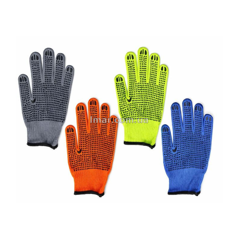 Основа перчаток выполнена из хлопчатобумажного трикотажа (х/б), который обеспечивает комфорт при длительном ношении, хорошую воздухопроницаемость и удобную посадку. ПВХ-точка на ладонной части и пальцах создаёт антискользящий эффект, благодаря чему предметы и инструмент меньше выскальзывают из рук. Манжет эластичный, хорошо фиксирует перчатку на запястье.