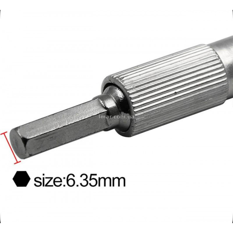 Вал изготовлен из закаленной стали с защитным покрытием, что обеспечивает долговечность и износостойкость. Гибкая часть усилена для предотвращения переломов и перегибов. Стандартный хвостовик 1/4 дюйма совместим с большинством шуруповертов.