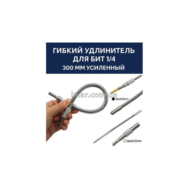 Гибкий удлинитель для бит 1/4 (вал для шуруповерта, 300 мм, усиленный) — это практичный и надежный аксессуар, который значительно облегчает работу с крепежом в труднодоступных местах. Благодаря длине 300 мм и усиленной конструкции инструмент обеспечивает удобство и долговечность.