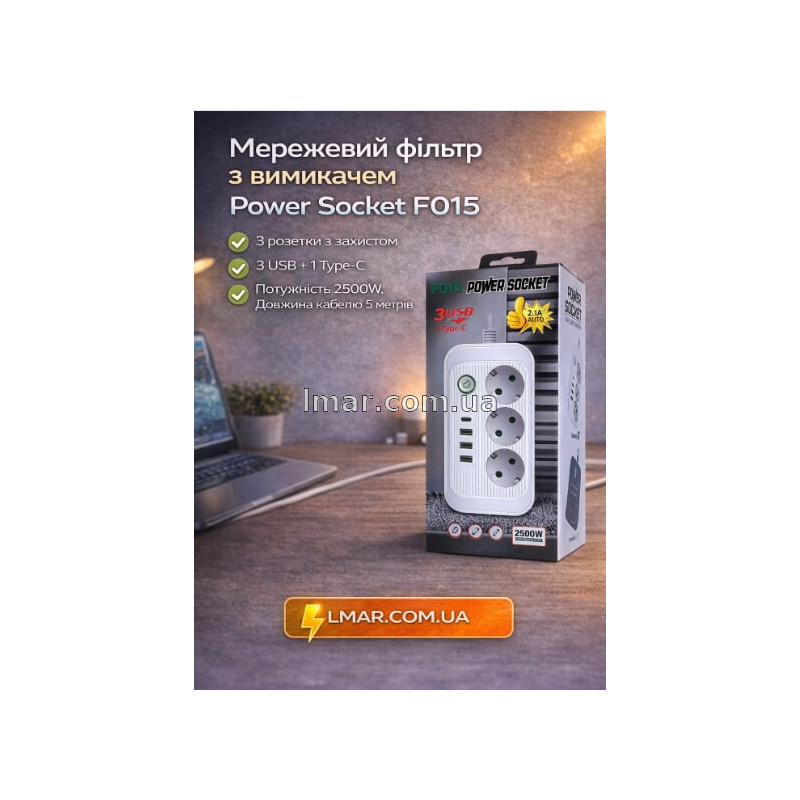 Сетевой фильтр Power Socket F015 на 3 розетки с 3 USB и Type-C — удобное решение для подключения техники и зарядки устройств. Нагрузка до 2500W, кабель 5 м, защита и выключатель делают его идеальным для дома, офиса и мастерской.