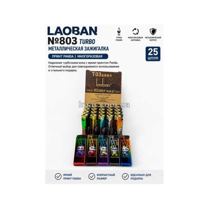 Металлическая турбо зажигалка LAOBAN №803 с ярким принтом Panda — многоразовая карманная зажигалка с мощным турбо-пламенем, стильным дизайном и компактным корпусом. Подходит для повседневного использования, подарка и оптовой продажи. В упаковке 25