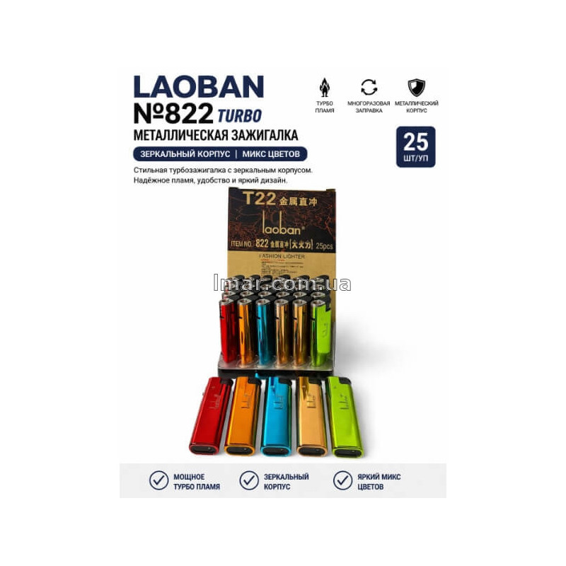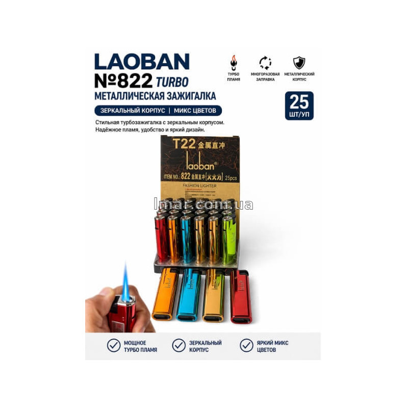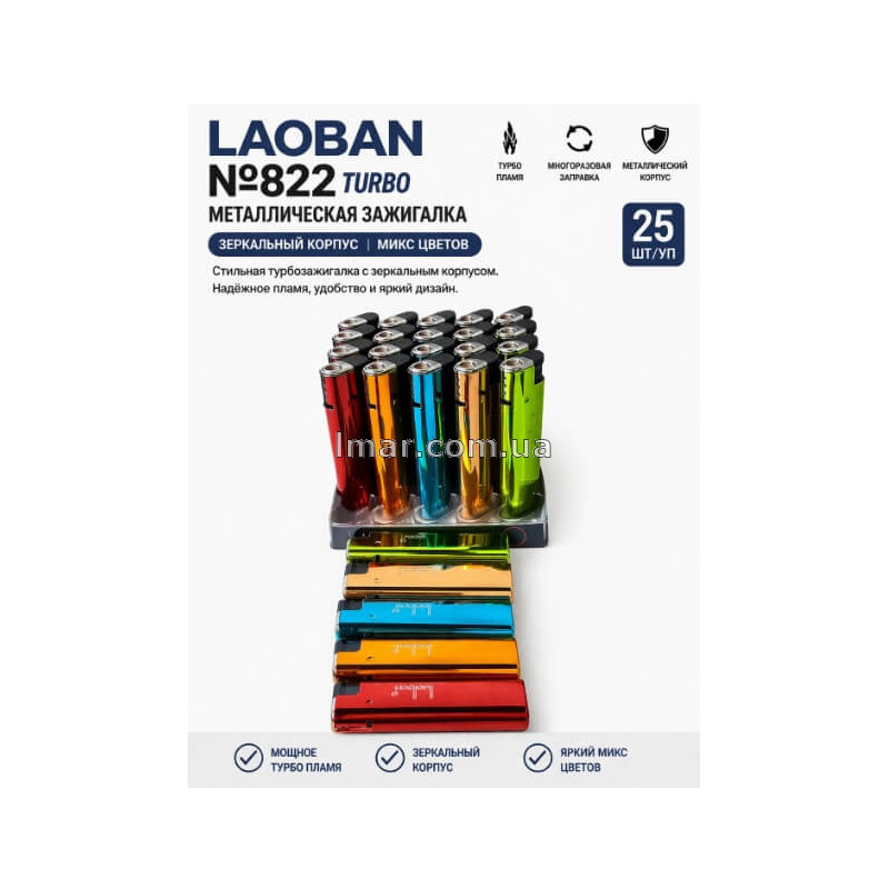 Металлическая турбо зажигалка LAOBAN №822 с зеркальным корпусом — стильная многоразовая карманная зажигалка с мощным турбо-пламенем и ярким миксом цветов. Прочный металлический корпус, компактный формат и удобство в использовании. В упаковке 25 шт