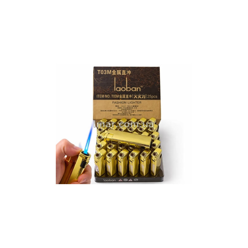 Металлическая турбо зажигалка LAOBAN T03M в золотом корпусе — стильная многоразовая карманная зажигалка с мощным турбо-пламенем, прочной металлической конструкцией и эффектным дизайном. Подходит для повседневного использования, подарка и оптовой