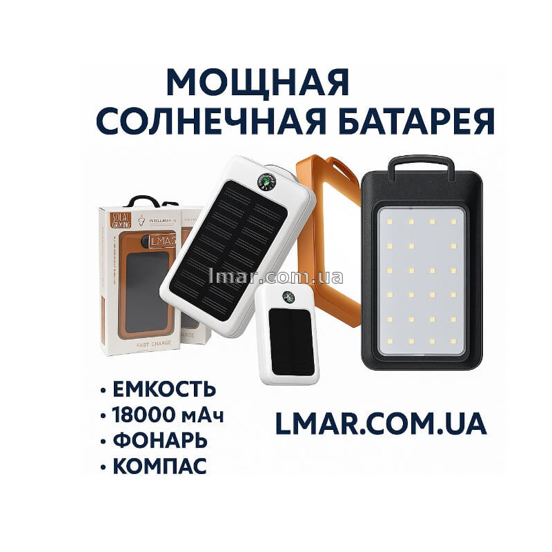 Power Bank сонячний 18000 mAh з ліхтариком і компасом (ударостійкий, вологозахист)