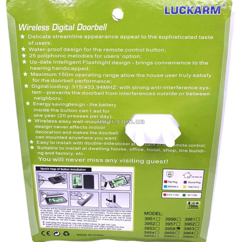 Якщо вам потрібен бездротовий дверний дзвінок у розетку 220В з регулюванням гучності, 25 мелодіями та дальністю до 150 метрів — LUCKARM 3958 стане зручним і надійним рішенням для щоденного використання.