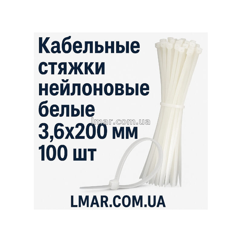 Нейлонові кабельні стяжки 3,6×200 мм (білі) — надійне рішення для фіксації дротів, кабелів і деталей. Міцні, гнучкі, стійкі до вологи й температур. В упаковці 100 шт. Ідеальні для дому, офісу, майстерні чи виробництва.
