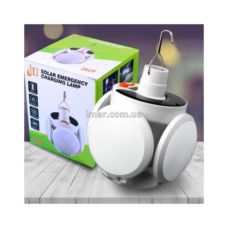 Сонячна лампа JD 2029 — це універсальний портативний світильник, який працює від вбудованого акумулятора та сонячної панелі. Вона поєднує функції аварійного освітлення, кемпінгового ліхтаря та домашнього нічника. Завдяки складній конструкції лампа зручна у зберіганні та транспортуванні.