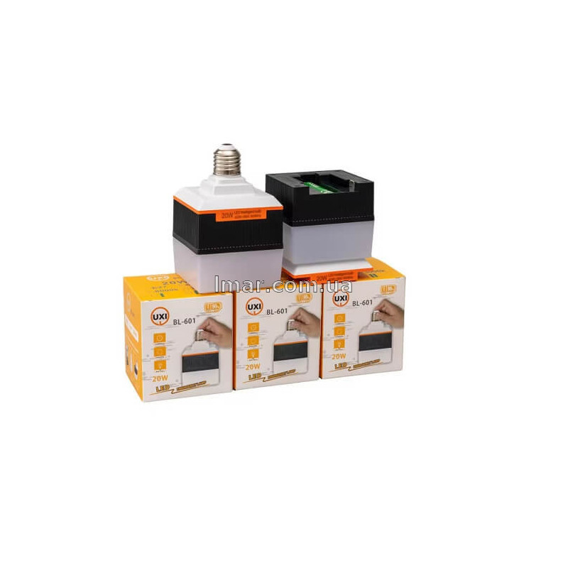 Світлодіодна аварійна лампа UXI E27 20Вт BL-601 з акумулятором. Яскраве світло, до 6 год автономної роботи. Для дому, офісу, дачі, гаража й аварійного освітлення.