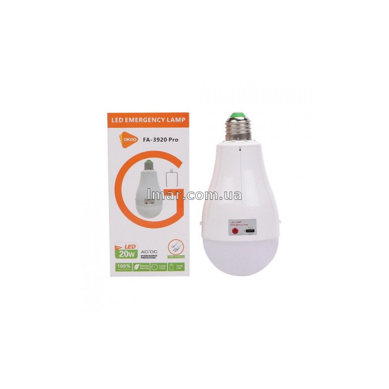 Аварійна LED лампа FA-3920 Pro потужністю 20 Вт з цоколем E27 і вбудованим акумулятором працює навіть під час відключення електроенергії. Ідеально підходить для дому, офісу, дачі чи магазину. Заряджається від мережі, автономно світить до 6 годин.