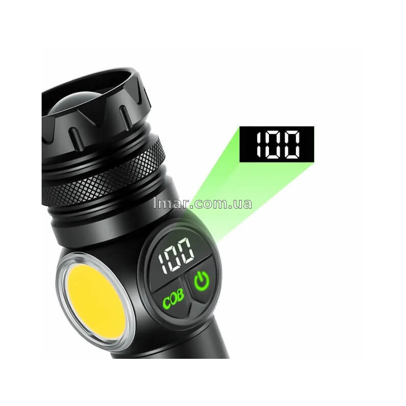 Корпус виконаний із міцного зносостійкого матеріалу з рифленою поверхнею для надійного хвату. Ергономічна форма дозволяє зручно тримати ліхтар у руці, а ремінець підвищує комфорт під час перенесення. Вбудований магніт допомагає фіксувати ліхтар на металевих поверхнях, звільняючи руки під час роботи. Цифровий дисплей показує рівень заряду акумулятора, що особливо зручно при тривалому використанні.