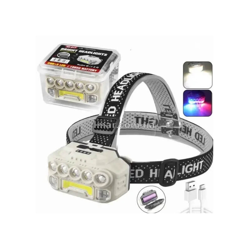 Ліхтар налобний акумуляторний HX-817S-COB з сенсором, Type-C, 1x18650, біле/червоне/синє світло