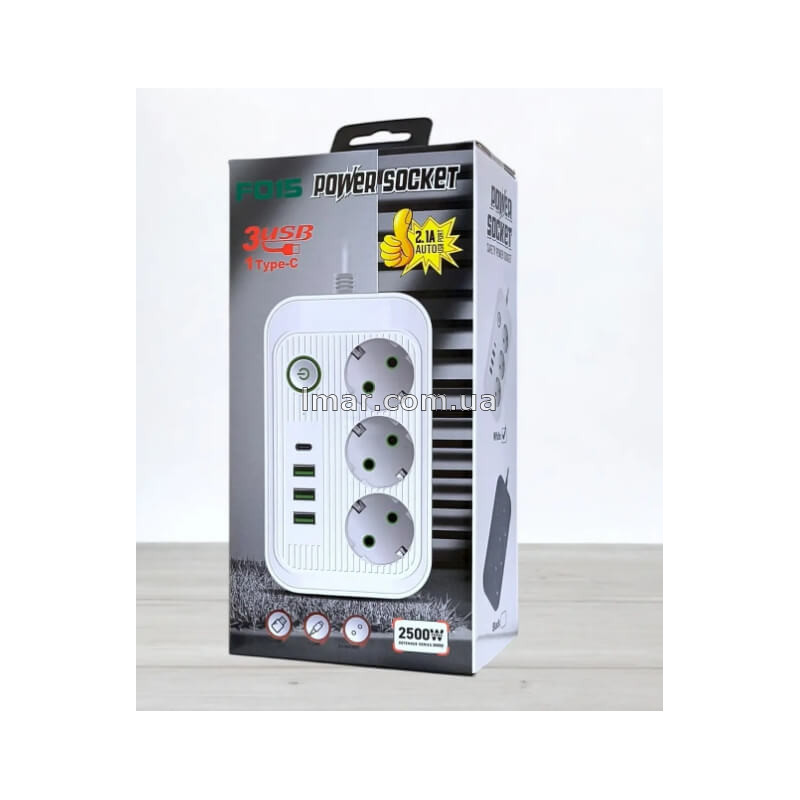 Мережевий фільтр Power Socket F015 на 3 розетки з 3 USB та Type-C — зручне рішення для підключення техніки й заряджання гаджетів. Потужність до 2500W, кабель 5 м, вимикач і захист роблять його ідеальним для дому, офісу та майстерні
