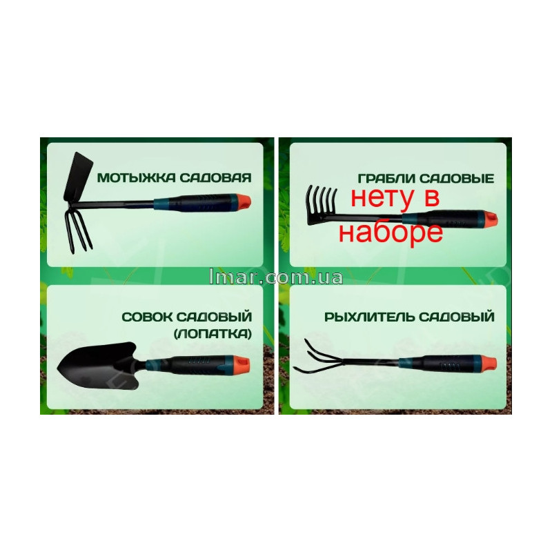 Зручні інструмент і мінімальний набір для кожного садівника, навіть з невеликою територією. Особливість полягає в пластикових ручках, які мають підвищений ергономікою за рахунок спеціальної форми і мінімального ваги, на відміну від дерева або металу. Робоча частина має стійкість до іржі, що збільшує термін експлуатації і запобігає передчасне руйнування або деформацію. Також варто звернути увагу на товщину металу яка змиє витримати підвищений тиск або падіння з великої висоти.