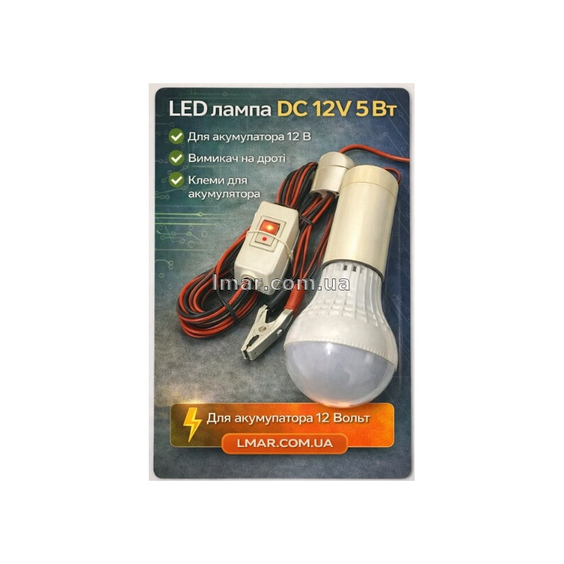 LED лампа DC 12V 5W з вимикачем на проводі та тримачем — зручне рішення для автономного освітлення від акумулятора. Економна, компактна й безпечна, підходить для дому, гаража, дачі, майстерні та аварійного освітлення.