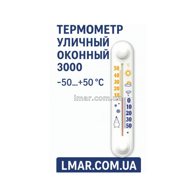 Вуличний віконний термометр 3000 для вимірювання температури від –50 до +50 °C. Легко кріпиться на скло чи стіну, стійкий до погодних умов. Компактний і зручний прилад для дому, офісу, дачі та господарських приміщень