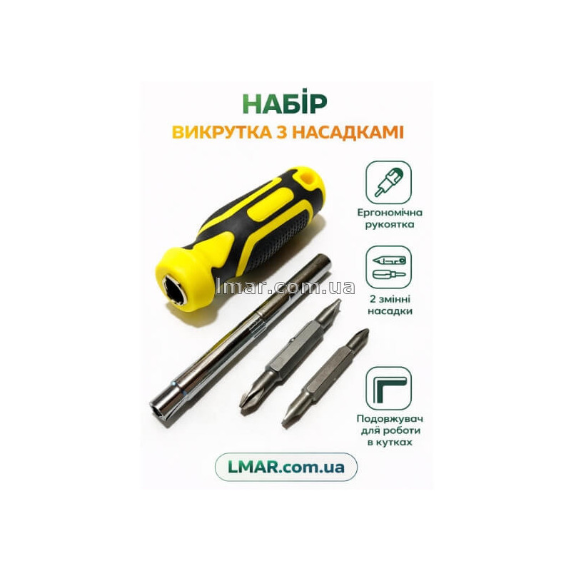 Універсальна викрутка 4 в 1 з гумовою ручкою: змінні біти, магніт, зручний хват. Ідеальна для ремонту вдома, в авто та техніці. Опт і роздріб від LMAR.