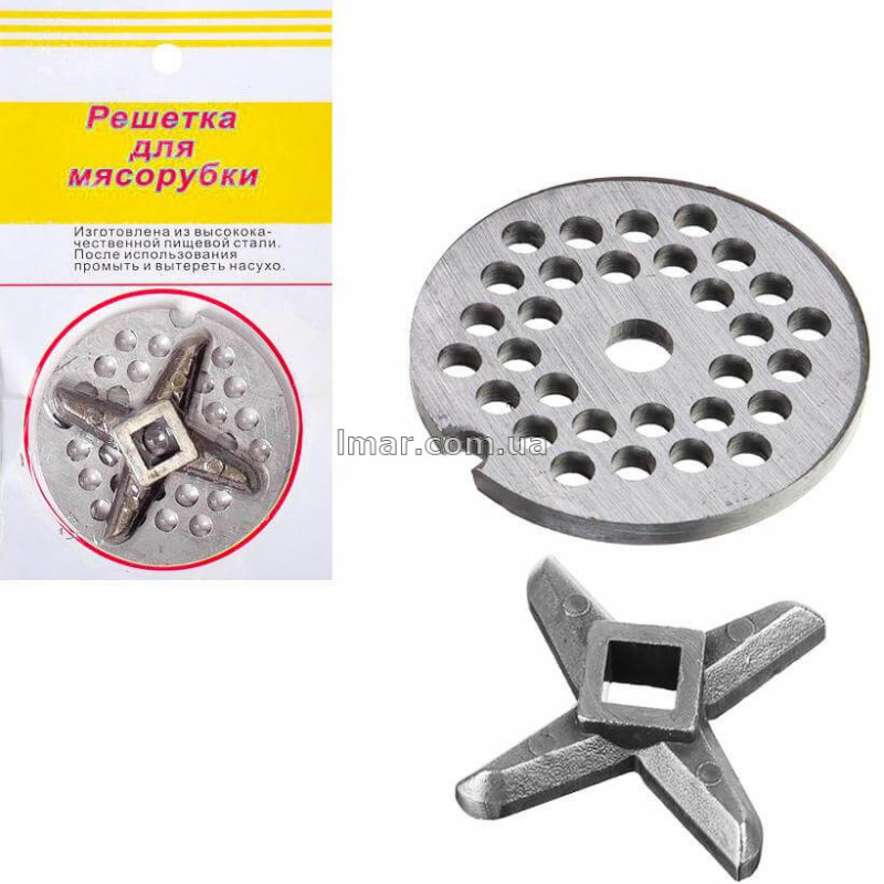 Набір для ручної м’ясорубки: ніж-хрестовина з 4 лезами та металева решітка (сітка). Підходить для більшості моделей. Міцна сталь забезпечує довговічність, чистий зріз і рівномірне подрібнення м’яса